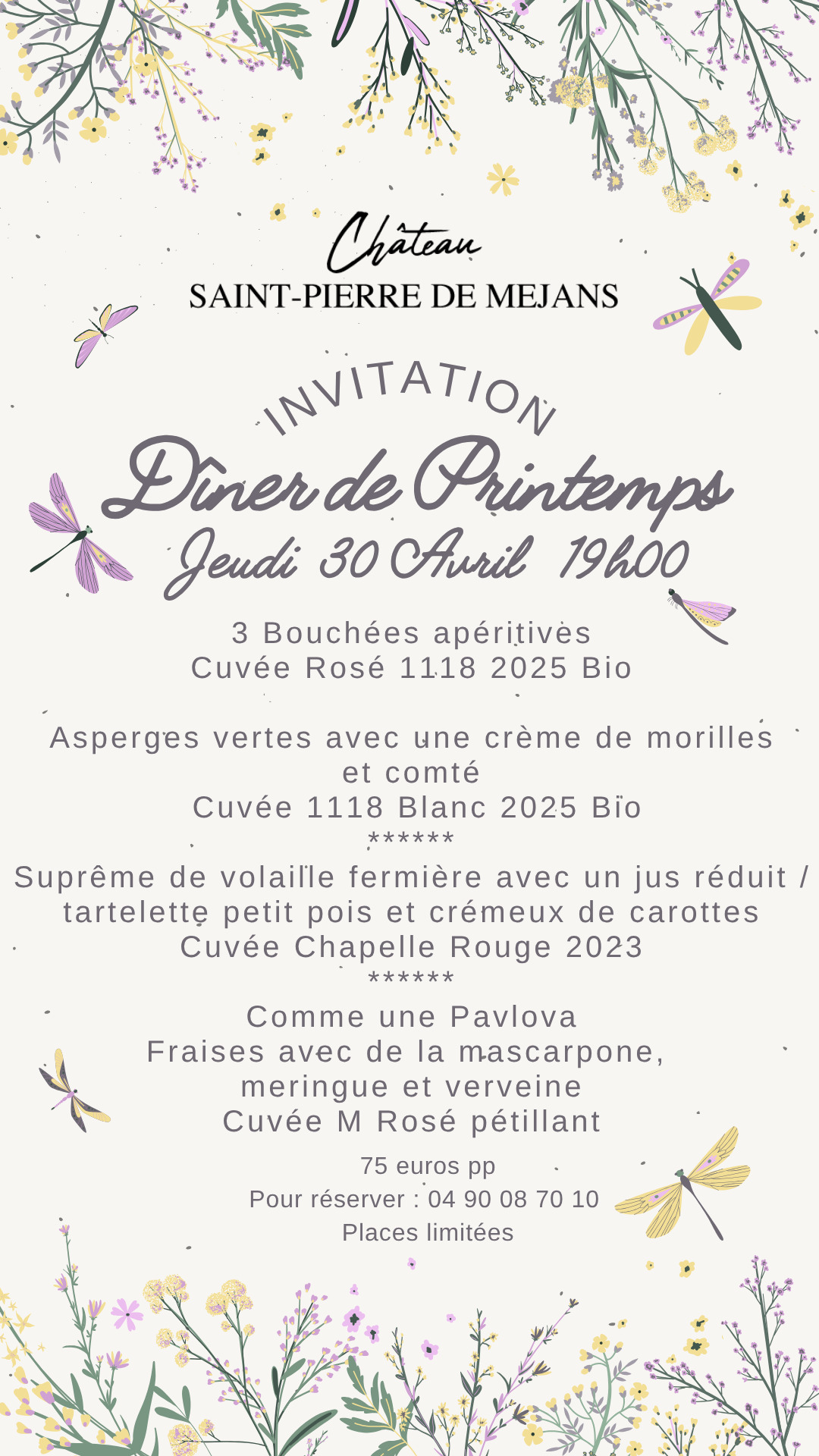 Dîner de Printemps au Château Saint-Pierre de Mejans : menu gastronomique en accord mets & vins bio du domaine. Une soirée conviviale autour des saveurs de saison. Places limitées.