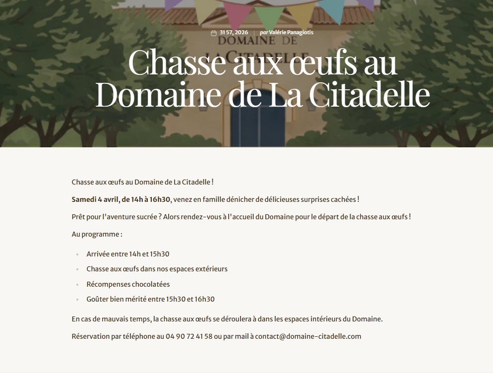 Le Domaine de la Citadelle vous invite à célébrer Pâques dans un cadre naturel et convivial. Petits et grands sont attendus pour une chasse aux œufs pleine de surprises au cœur des espaces extérieurs du domaine.